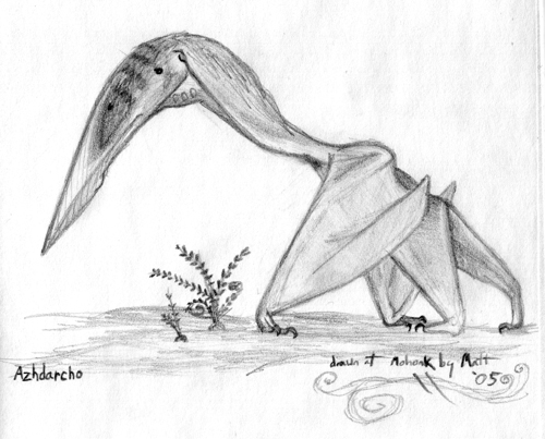 of subtle and dramatic changes in shape and tension. Also note Azhdarcho's coat of ptero-fuzz, a form of insulation that was very soft and hair-like. Ptero-fuzz may be homologous with dino-fuzz and bird feathers, but this seems unlikely. Impressions from pterodactyloids like azhdarchs typically show a longer 'mane' of ptero-fuzz on the neck, which may have helped make these animals more aerodynamic. The presence of insulatory skin coverings and the continuing discoveries that support pterosaurs as highly active fliers are enough to convince a vast majority of paleontologists that these reptiles were warm blooded. Pterosaurs, like dinosaurs and crocodiles, belong to the reptile group Archosauromorpha. Long thought to be close relatives of dinosaurs, it is also possible that they belong to the more primitive Prolacertiformes, a strange group including the superficially chameleon-like drepanosaurs and the extremely long-necked tanystropheids. Azhdarchidae is classified within the sub-group of pterosaurs known as Pterodactyloidea. All azhdarchs were toothless, and they may have inahbitated mainly inland, terrestrial niches similar to modern storks, nabbing small vertebrates with their spear-like jaws (hence Azhdarcho's specific name, lancicollis, meaning "lance-neck"). Azhdarcho itself was discovered by Nessov in 1982 in Uzbekistan (you can read the original description by clicking the reference below), and lived from the Turonian to the Coniacian age of the Late Cretaceous. For more on Azhdarcho, see the Wikipedia article I helped edit. References: Astibia, H., Buffetaut, E., Buscalioni, A.D., Cappetta, H., Corrall, C., Estes, R., Garcia-Garmilla, F., Jaeger, J.J., Jimenez-Fuentes, E., Loeuff, J., Mazin, J.M., Orue-Etxebarria, X., Pereda-Suberbiola, J., Powell, J.E., Rage, J.C., Rodriguez-Lazaro, J., Sanz, J.L., and Tong, H. (1991) "The fossil vertebrates from Lafio (Basque Country, Spain); new evidence on the composition and affinities of the Late Cretaceous continental fauna of Europe." Terra Nova, 2: 460-466. Bennett, S.C. (2000). "Pterosaur flight: the role of actinofibrils in wing function." Historical Biology, 14: 255-284 Nessov, L.A. (1990) [Flying reptiles of the Jurassic and Cretaceous of the